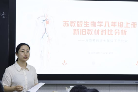 在教材研究环节,南京市将军山中学吴莹老师开设题为《苏教版生物学八年级上册新旧教材对比分析》的讲座。吴老师从目录结构入手,系统梳理两版教材在内容编排、概念表述等方面的变化,细致解读新教材在科学性与严谨性方面的优化,为教师准确把握新课标、高效使用新教材提供了实用参考。